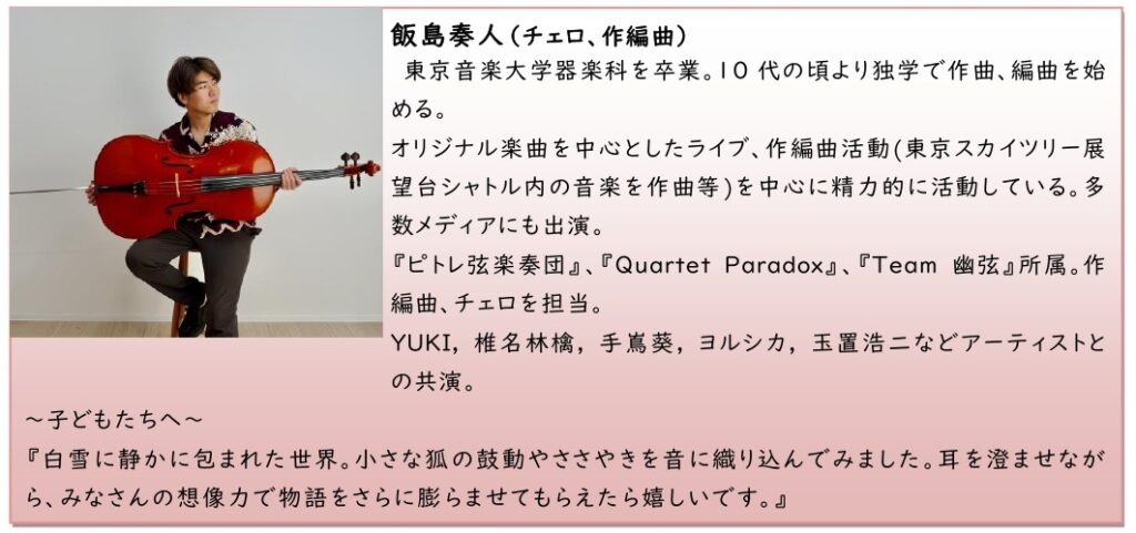新美南吉作の児童文学「手ぶくろを買いに」を“音楽の絵本”コンサートとして、「ピトレ弦楽奏団」のゆかいなアンサンブル&「なにぬの屋」渋沢やこさんの語りでお届けします。小さな子どもから大人まで一緒にクラシック音楽が楽しめます。