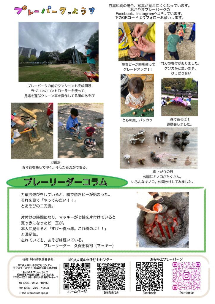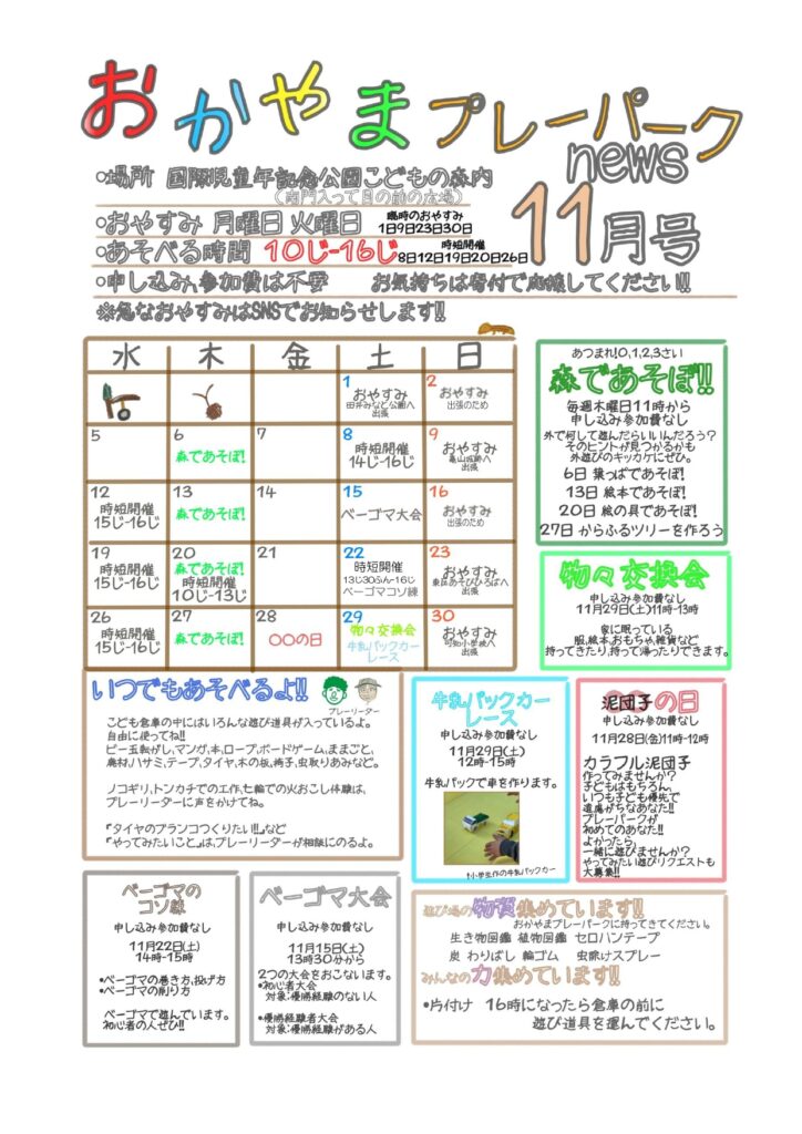 11月は出張が多く日曜日が全ておやすみです。市内各所で開催のプレーパークで遊んでね!